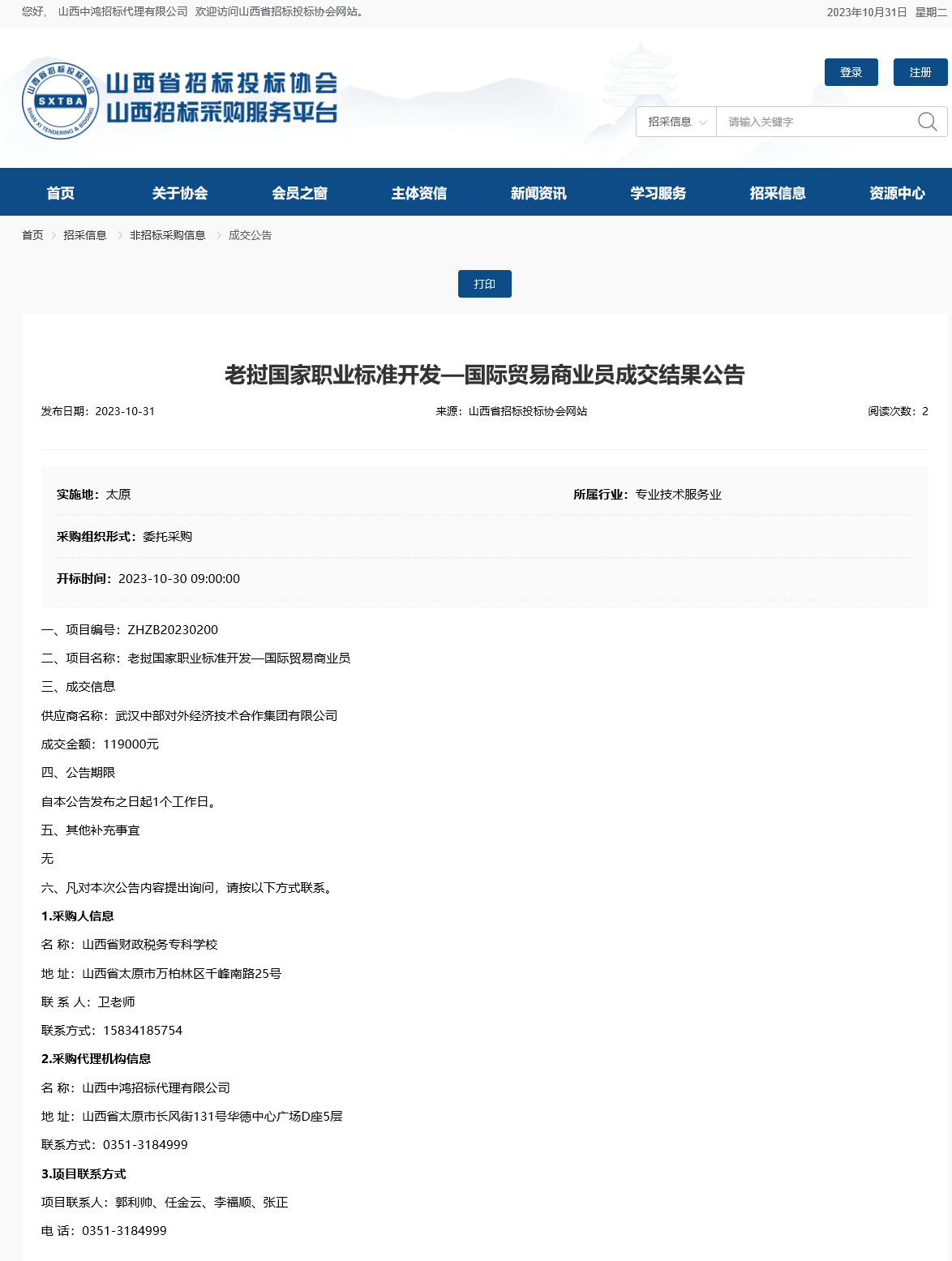 2023年10月31日,山西中鸿招标代理有限公司受bat365委托,对bat365“老挝国家职业标准开发--国际贸易商业员”项目进行招标采购,并于2023年10月30日组织开标、评标。山西省招投标网关于本项目公告如下: