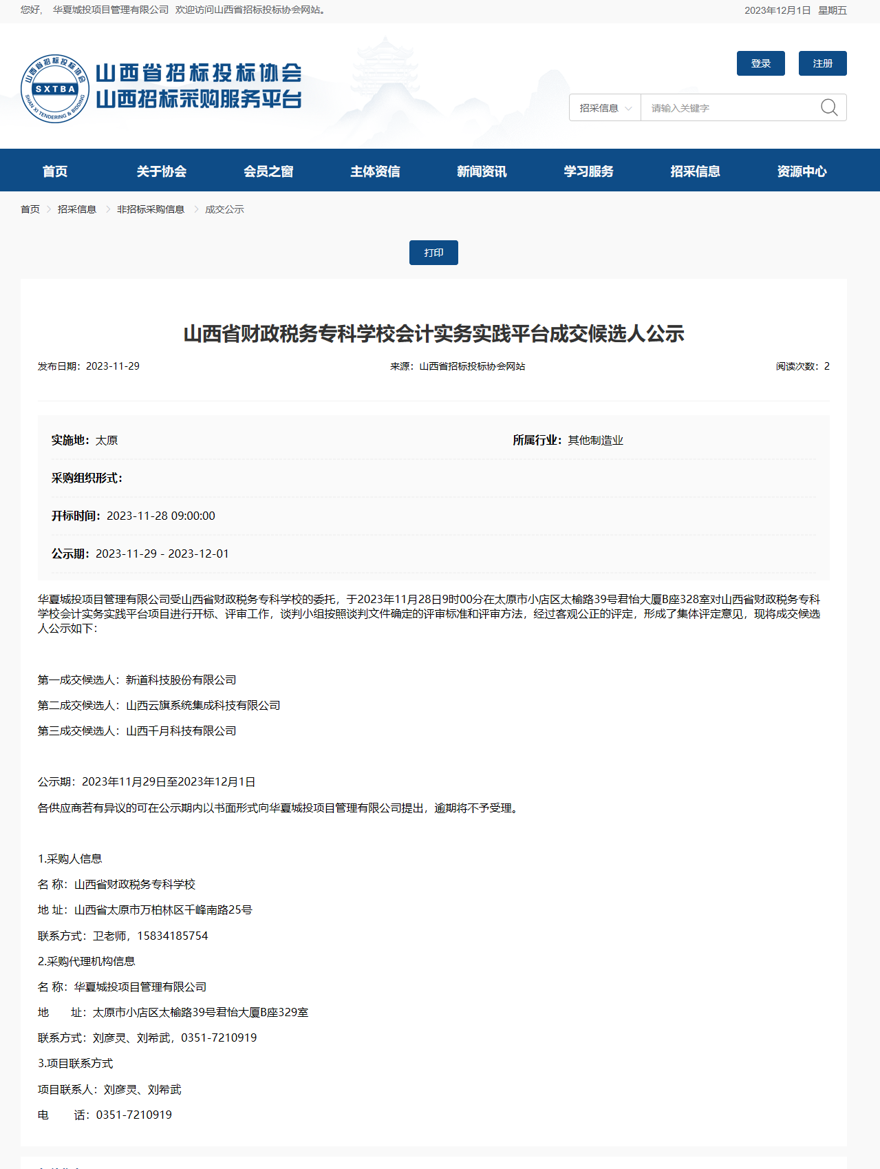 2023年11月29日,华夏城投项目管理有限公司受bat365委托,对bat365“会计实务实践平台”项目进行招标采购,并于2023年11月28日完成评审工作。山西省招投标网关于本项目成交候选人公示如下: