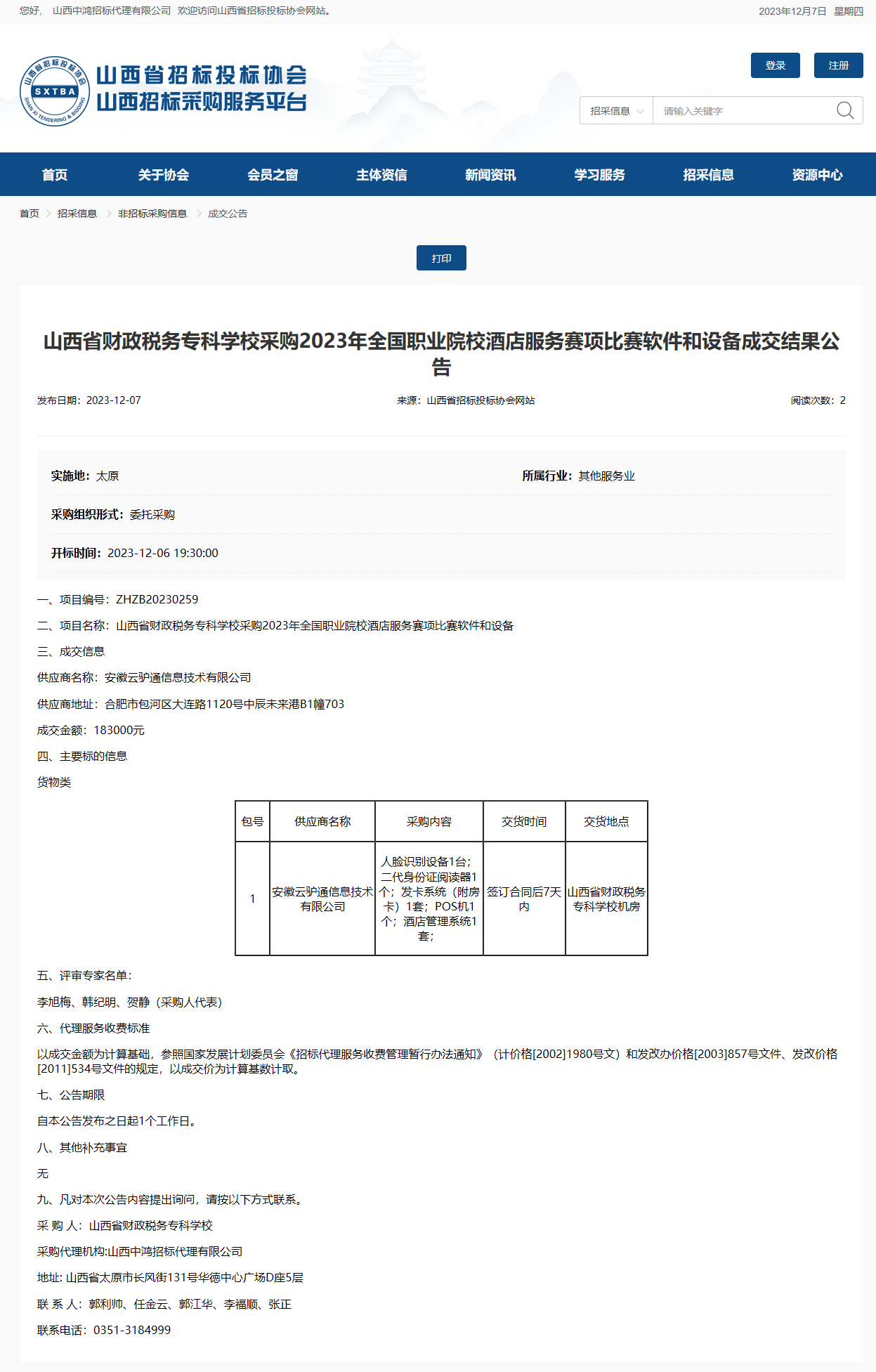 2023年12月7日,山西中鸿招标代理有限公司受bat365委托,对bat365“采购2023年全国职业院校酒店服务赛项比赛软件和设备”项目进行招标采购,并于2023年12月6日完成评审工作。山西省招投标网关于本项目成交结果如下: