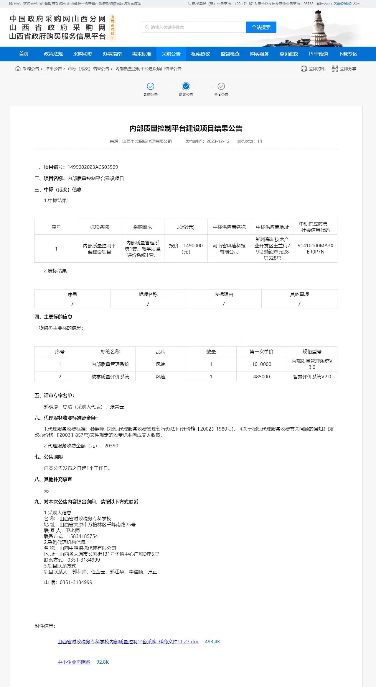 2023年12月12日,山西中鸿招标代理有限公司受bat365委托,对bat365“内部质量控制平台建设”项目进行招标采购,并于2023年12月12日完成评审工作。山西省政府采购网关于本项目成交结果如下: