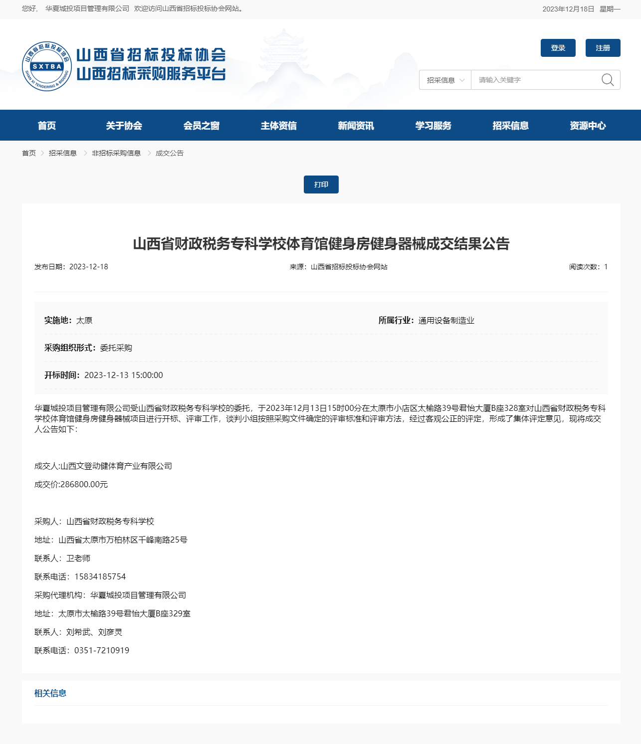 2023年12月18日,华夏城投项目管理有限公司受bat365委托,对bat365“体育馆健身房健身器材”项目进行招标采购,并于2023年12月13日完成评审工作。山西省招投标网关于本项目成交结果如下: