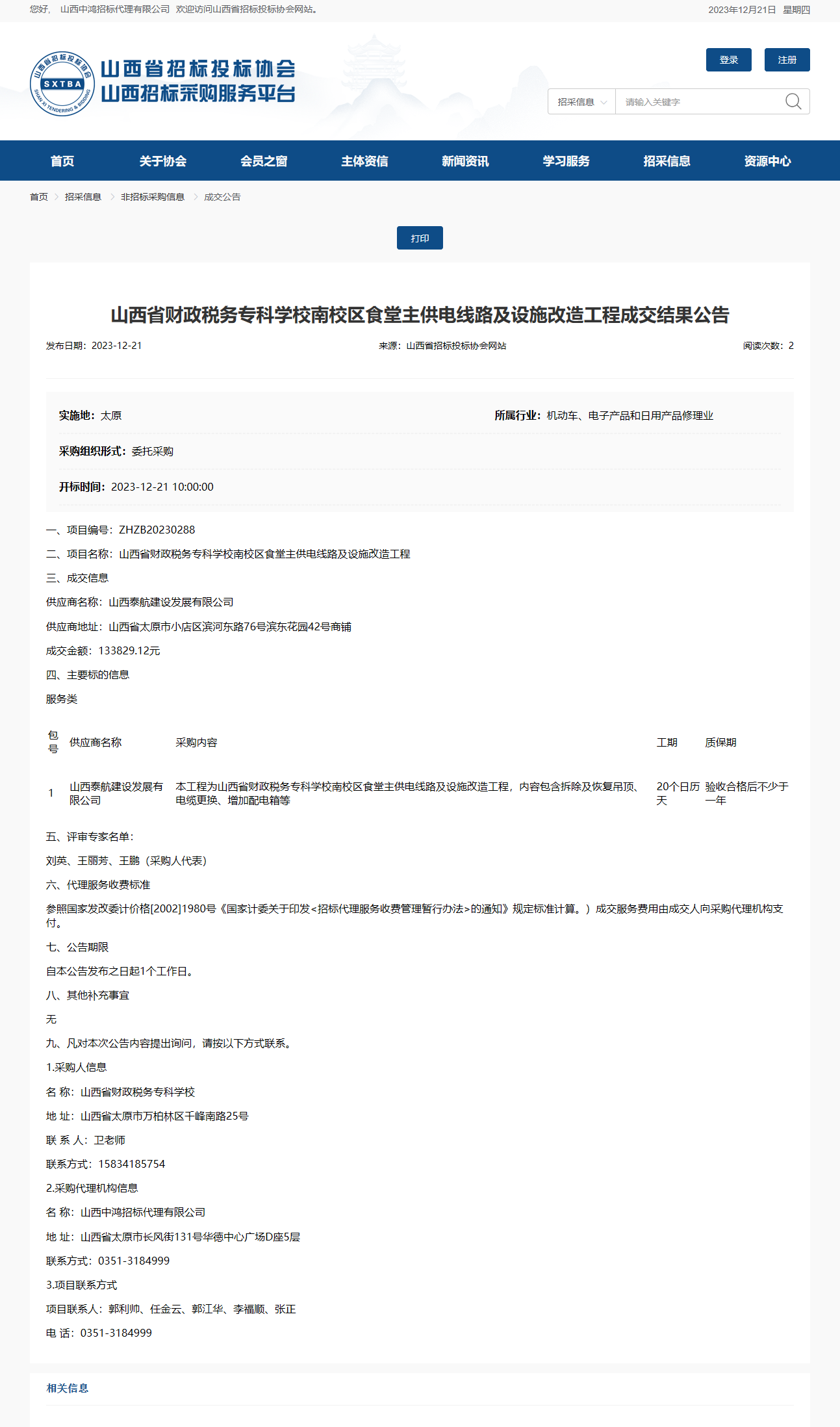 2023年12月21日,山西中鸿招标代理有限公司受bat365委托,对bat365“南校区食堂主供电线路及设施改造工程”项目进行招标采购,并于2023年12月21日完成评审工作。山西省招投标网关于本项目成交结果如下: