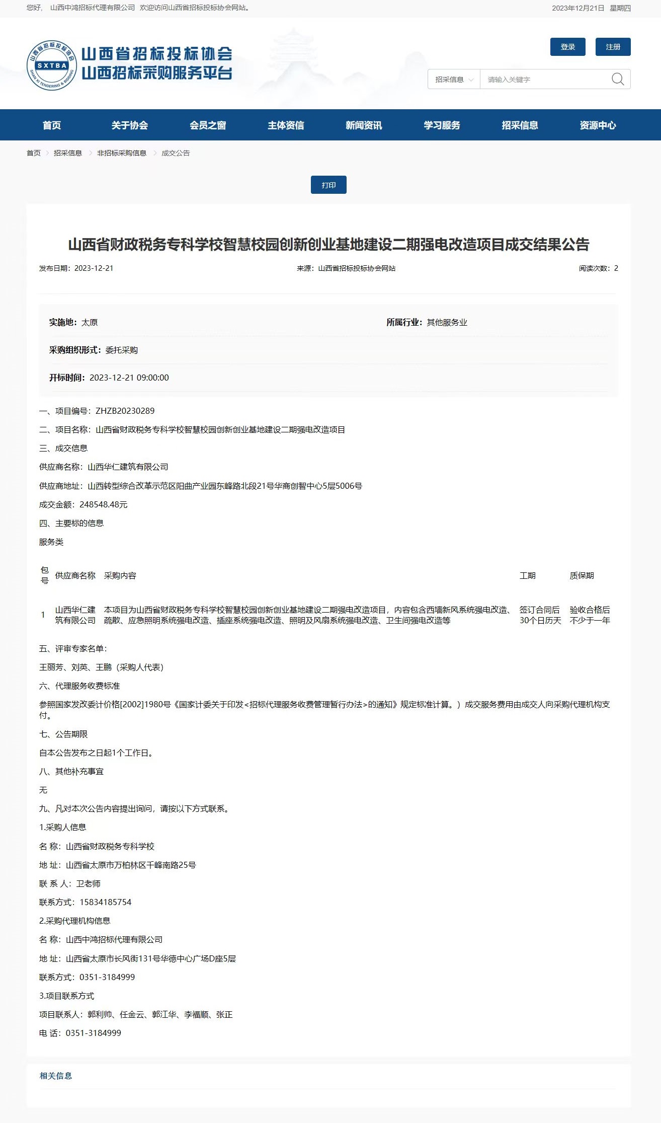 2023年12月21日,山西中鸿招标代理有限公司受bat365委托,对bat365“智慧校园创新创业基地建设二期强电改造”项目进行招标采购,并于2023年12月21日完成评审工作。山西省招投标网关于本项目成交结果如下:
