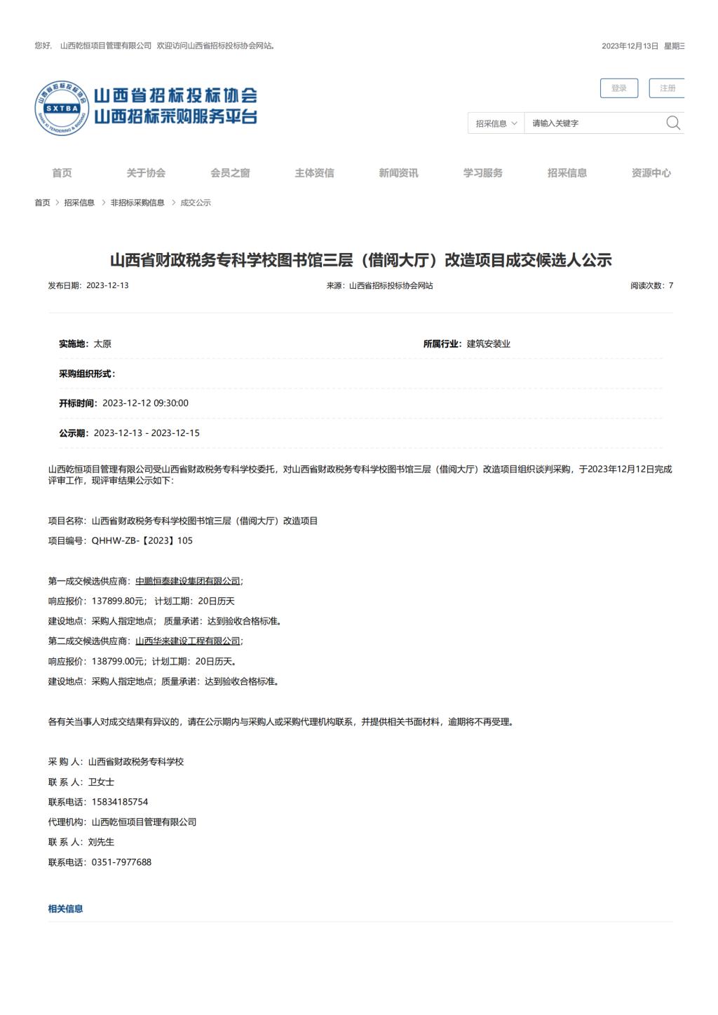 2023年12月13日,山西乾恒项目管理有限公司受bat365委托,对bat365“图书馆三层(借阅大厅)改造”项目进行招标采购,并于2023年12月12日完成评审工作。山西省招投标网关于本项目成交候选人公示如下:
