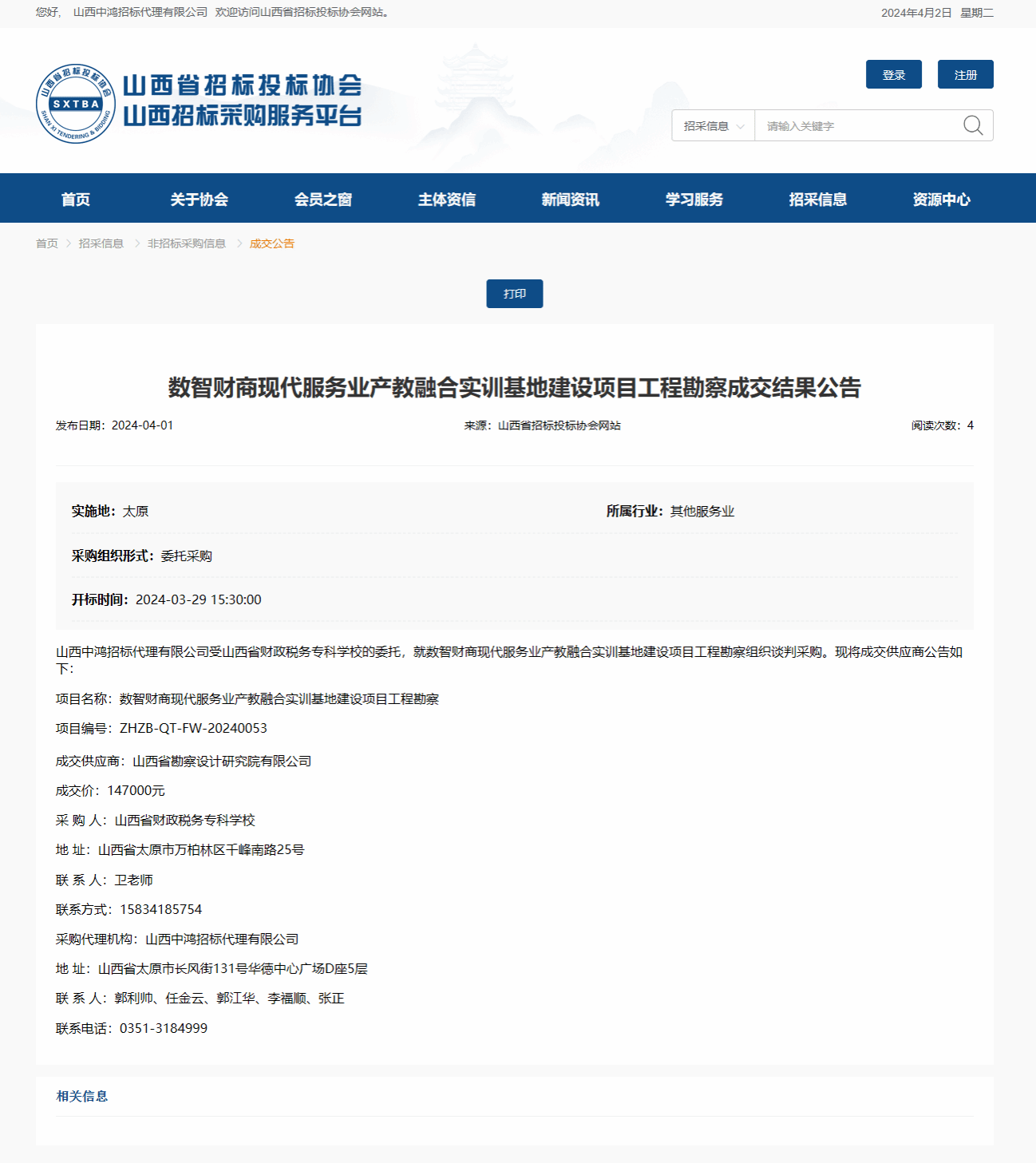 2024年4月1日,山西中鸿招标代理有限公司受bat365委托,对bat365“数智财商现代服务业产教融合实训基地建设项目工程勘察”进行招标采购,并于2024年3月29日完成评审工作。山西省招投标网关于本项目成交结果如下: