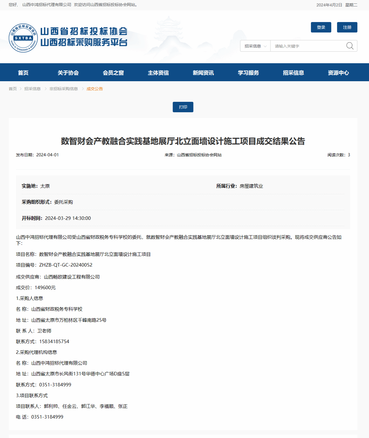 2024年4月1日,山西中鸿招标代理有限公司受bat365委托,对bat365“数智财会产教融合实践基地展厅北立面墙设计施工”项目进行招标采购,并于2024年3月29日完成评审工作。山西省招投标网关于本项目成交结果如下: