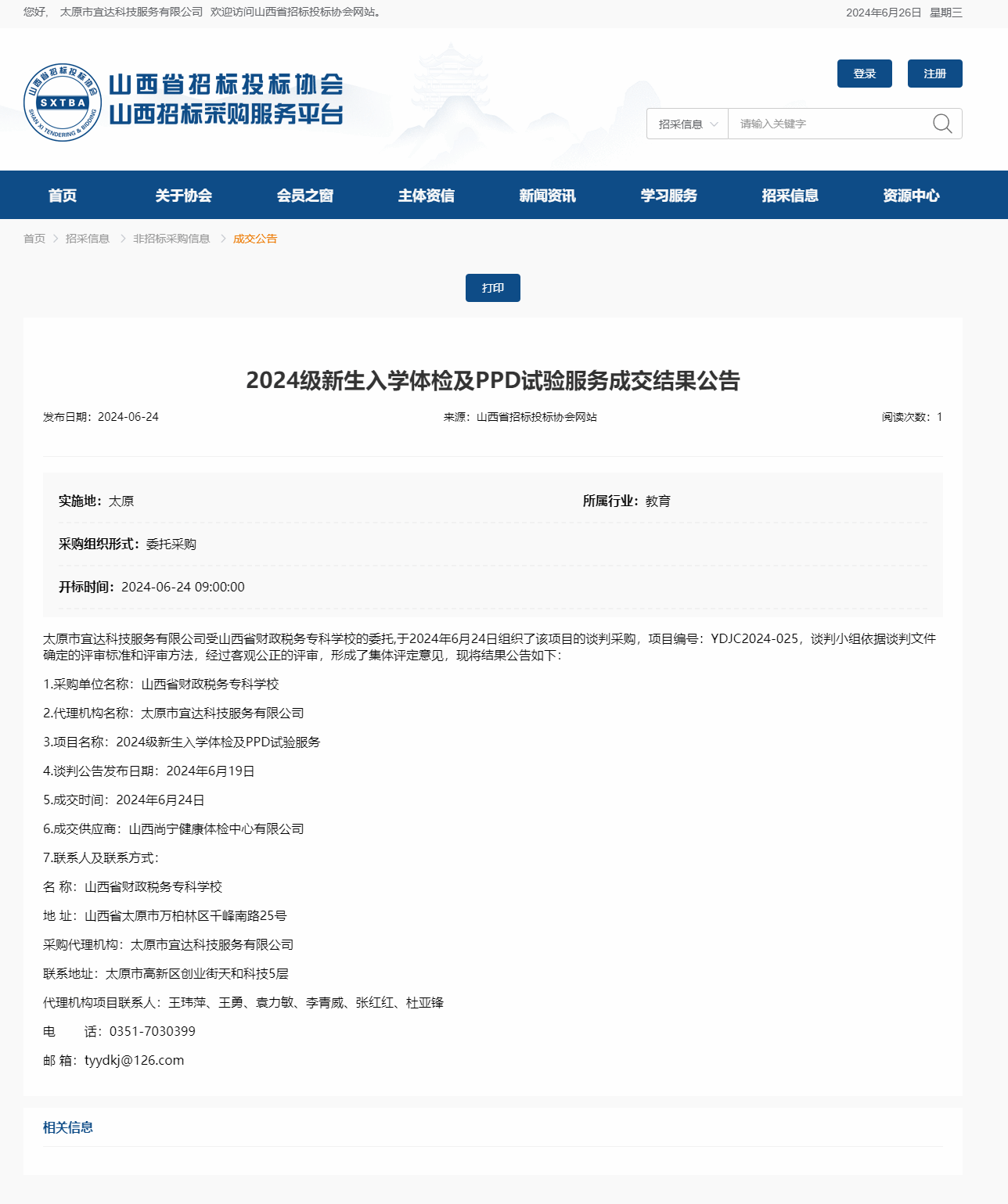 2024年6月24日,太原市宜达科技服务有限公司受bat365委托,对bat365“2024级新生入学体检及PPD试验服务”项目进行招标采购,并于2024年6月24日完成评审工作。山西省招标投标协会网关于本项目成交结果如下: