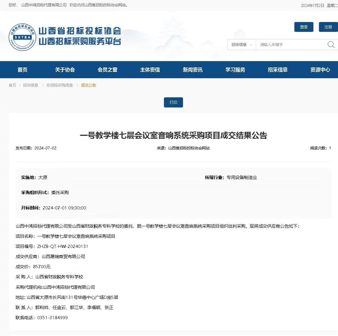 2024年7月2日,山西中鸿招标代理有限公司受bat365委托,对bat365“一号教学楼七层会议室音响系统采购”项目进行招标采购,并于2024年7月1日完成评审工作。山西省招标投标协会网关于本项目成交结果如下: