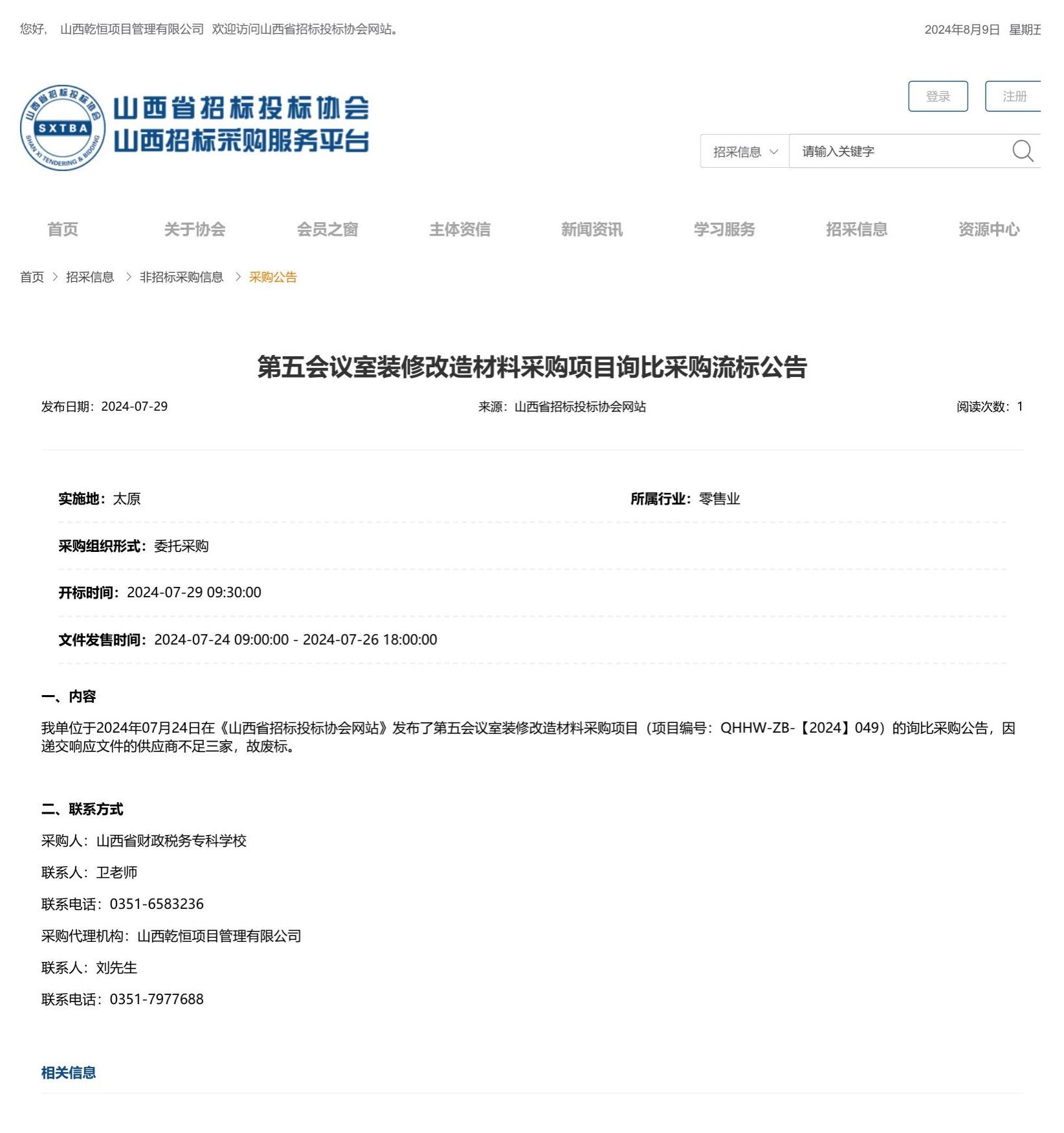 2024年7月29日,山西乾恒项目管理有限公司受bat365委托,对bat365“第五会议室装修改造材料”项目进行招标采购,并于2024年7月29日完成评审工作。山西省招标投标协会网关于本项目成交结果如下: