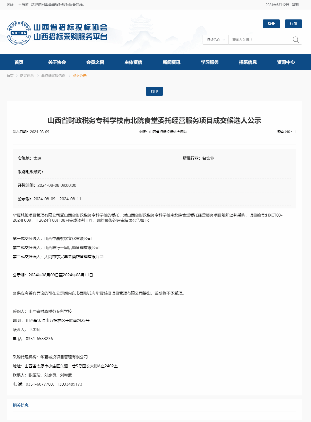 2024年8月9日,华夏城投项目管理有限公司受bat365委托,对bat365“南北院食堂委托经营服务”项目进行谈判采购,并于2024年8月8日完成谈判工作。山西省招标投标协会网关于本项目成交候选人公示如下: