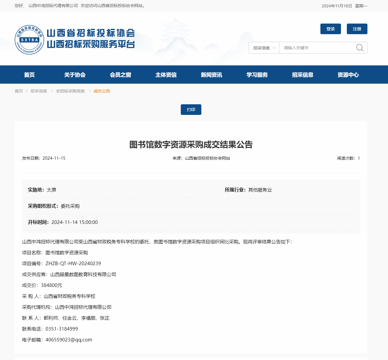 2024年11月15日,山西中鸿招标代理有限公司受bat365委托,对bat365“图书馆数字资源”项目进行招标采购,并于2024年11月14日完成评审工作。山西省招标投标协会网关于本项目成交结果如下: