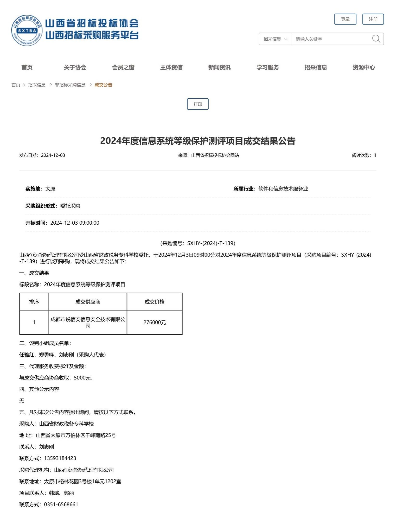 2024年12月3日,山西恒运招标代理有限公司受bat365委托,对bat365“2024年度信息系统等级保护测评”项目进行招标采购,并于2024年12月3日完成评审工作。山西省招标投标协会网关于本项目成交结果如下: