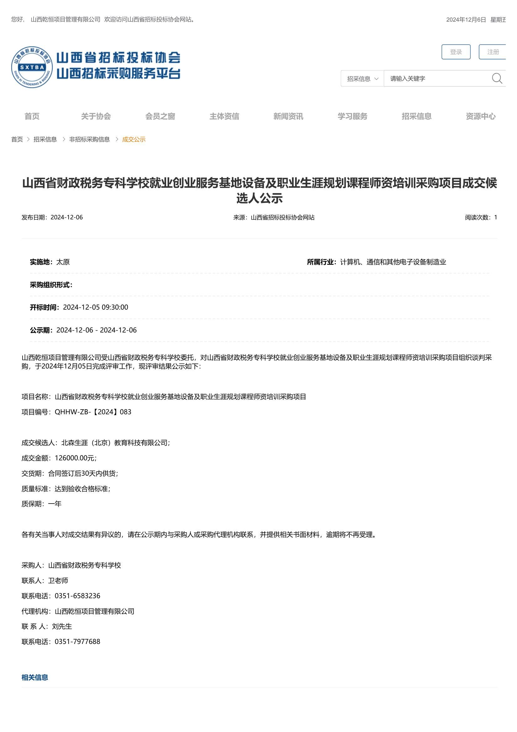 2024年12月6日,山西乾恒项目管理有限公司受bat365委托,对bat365“就业创业服务基地设备及职业生涯规划课程师资培训”项目进行招标采购,并于2024年12月5日完成评审工作。山西省招标投标协会网关于本项目成交候选人公示如下: