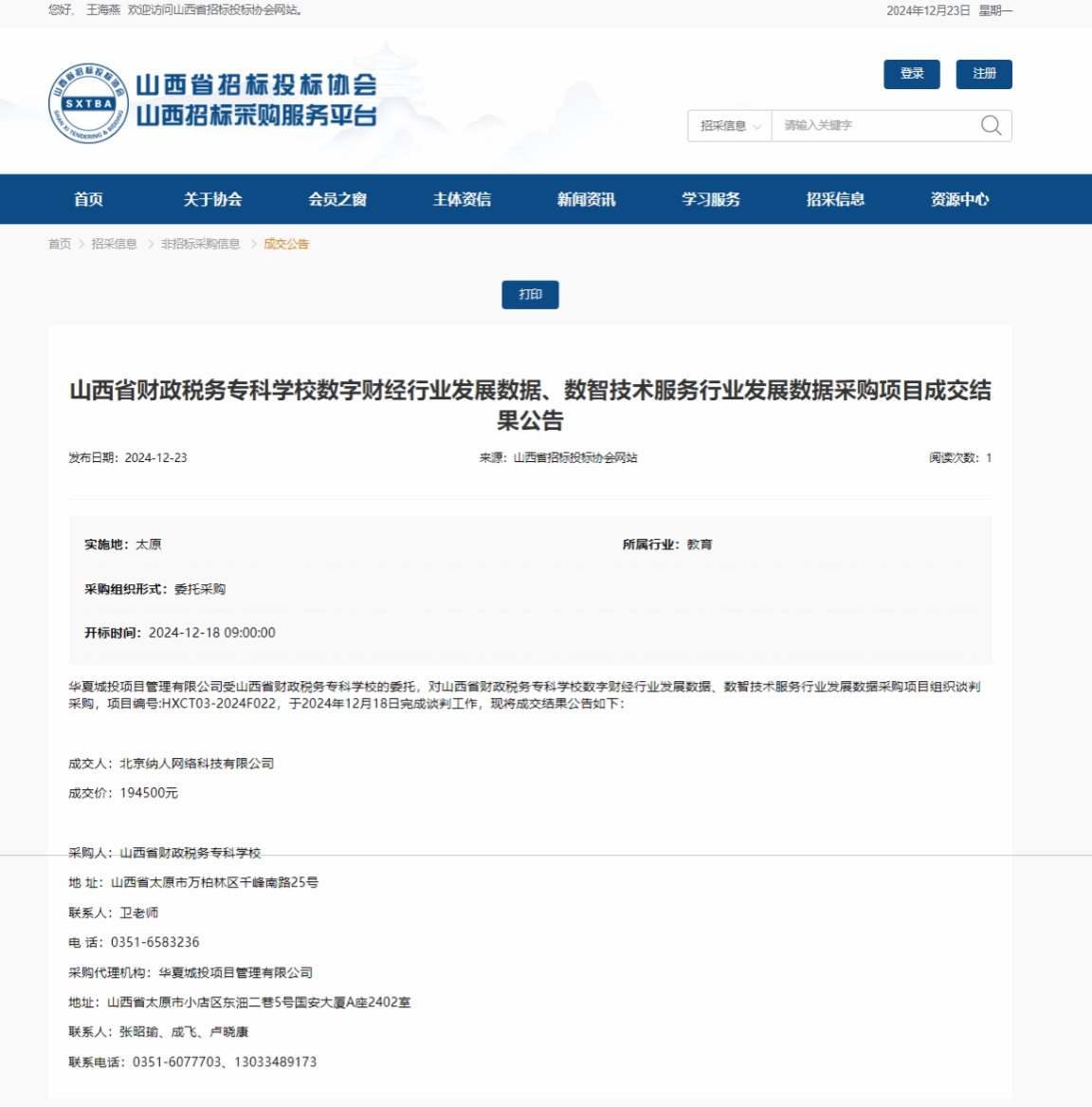 2024年12月23日,华夏城投项目管理有限公司受bat365委托,对bat365“数字财经行业发展数据、数智技术服务行业发展数据”项目进行招标采购,并于2024年12月18日完成评审工作。山西省招标投标协会网关于本项目成交结果公告如下: