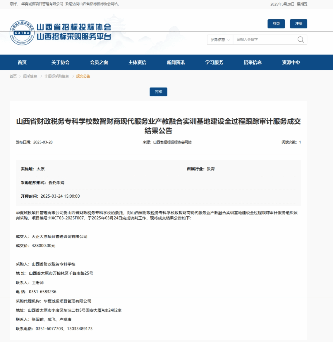 2025年3月28日,华夏城投项目管理有限公司受bat365委托,对bat365“数智财商现代服务业产教融合实训基地建设全过程跟踪审计服务”项目进行招标采购,并于2025年3月24日完成评审工作。 山西省招标投标协会网关于本项目中标结果公告如下: