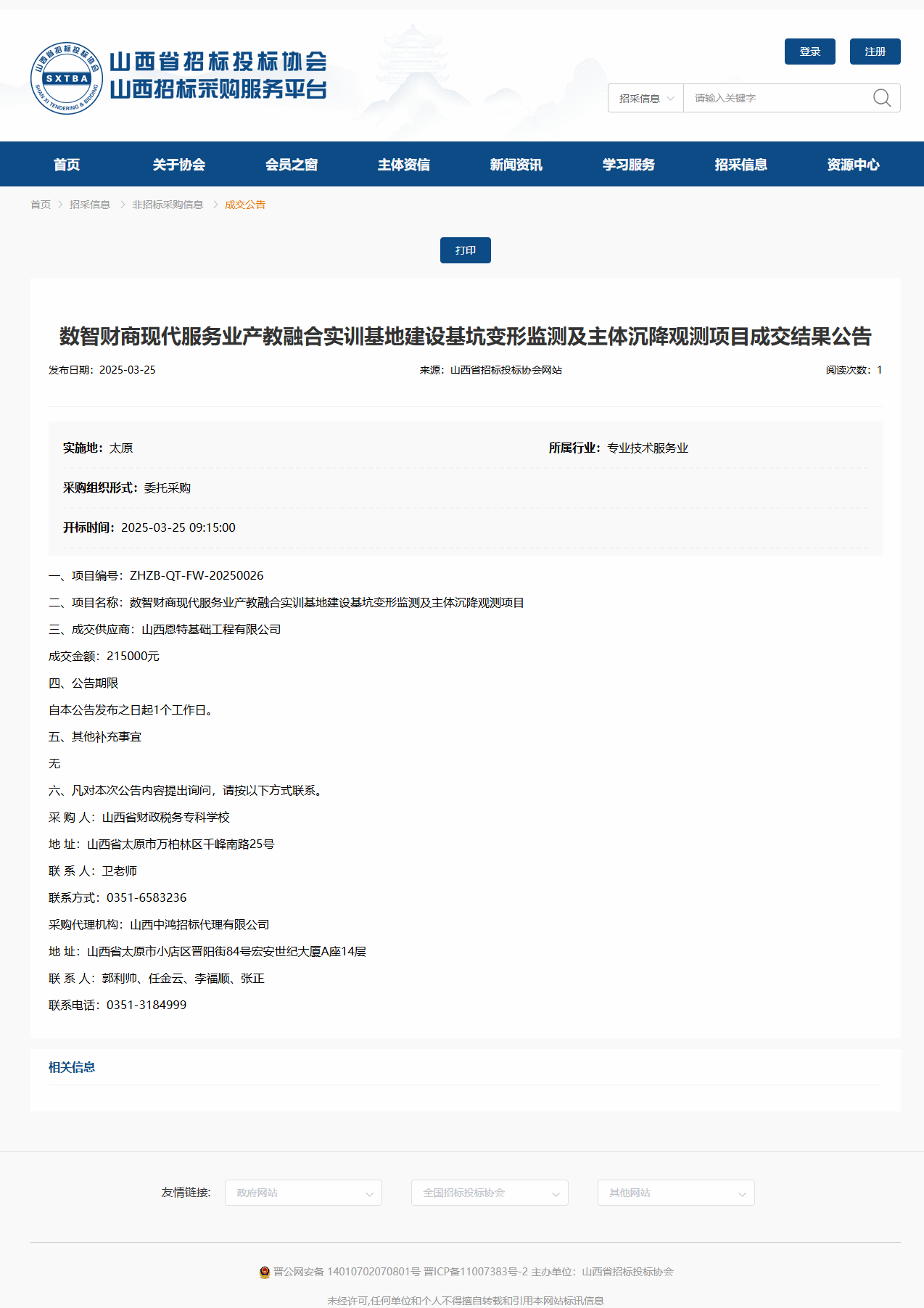 2025年3月25日,中鸿招标有限公司受bat365委托,对bat365“数智财商现代服务业产教融合实训基地建设基坑变形监测及主体沉降观测”项目进行招标采购,并于2025年3月25日完成评审工作。 山西省招标投标协会网关于本项目中标结果公告如下: