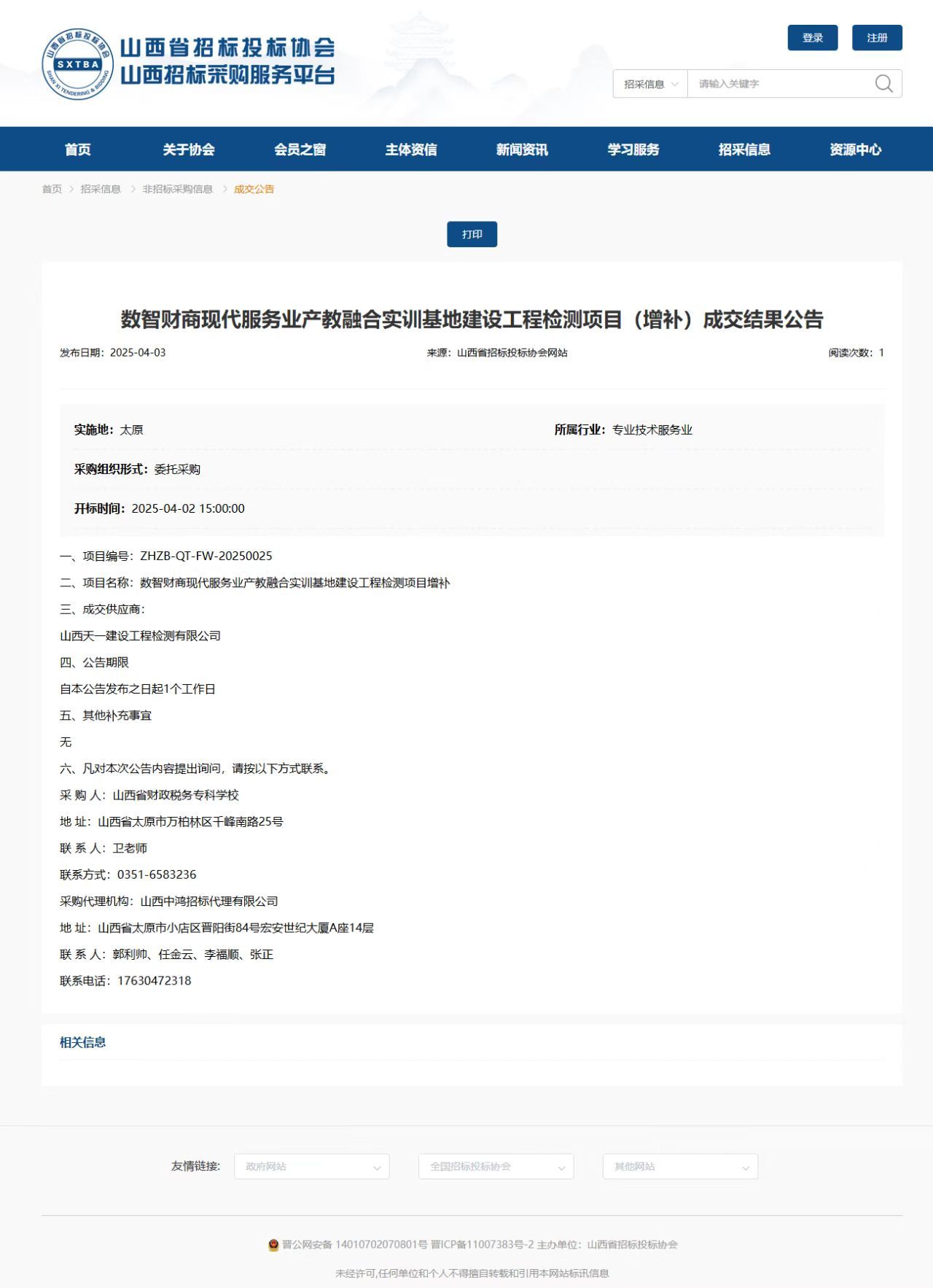 2025年4月3日,山西中鸿招标代理有限公司受bat365委托,对bat365“数智财商现代服务业产教融合实训基地建设工程检测”项目(增补)进行招标采购,并于2025年4月2日完成评审工作。 山西省招标投标协会网关于本项目中标结果公告如下: