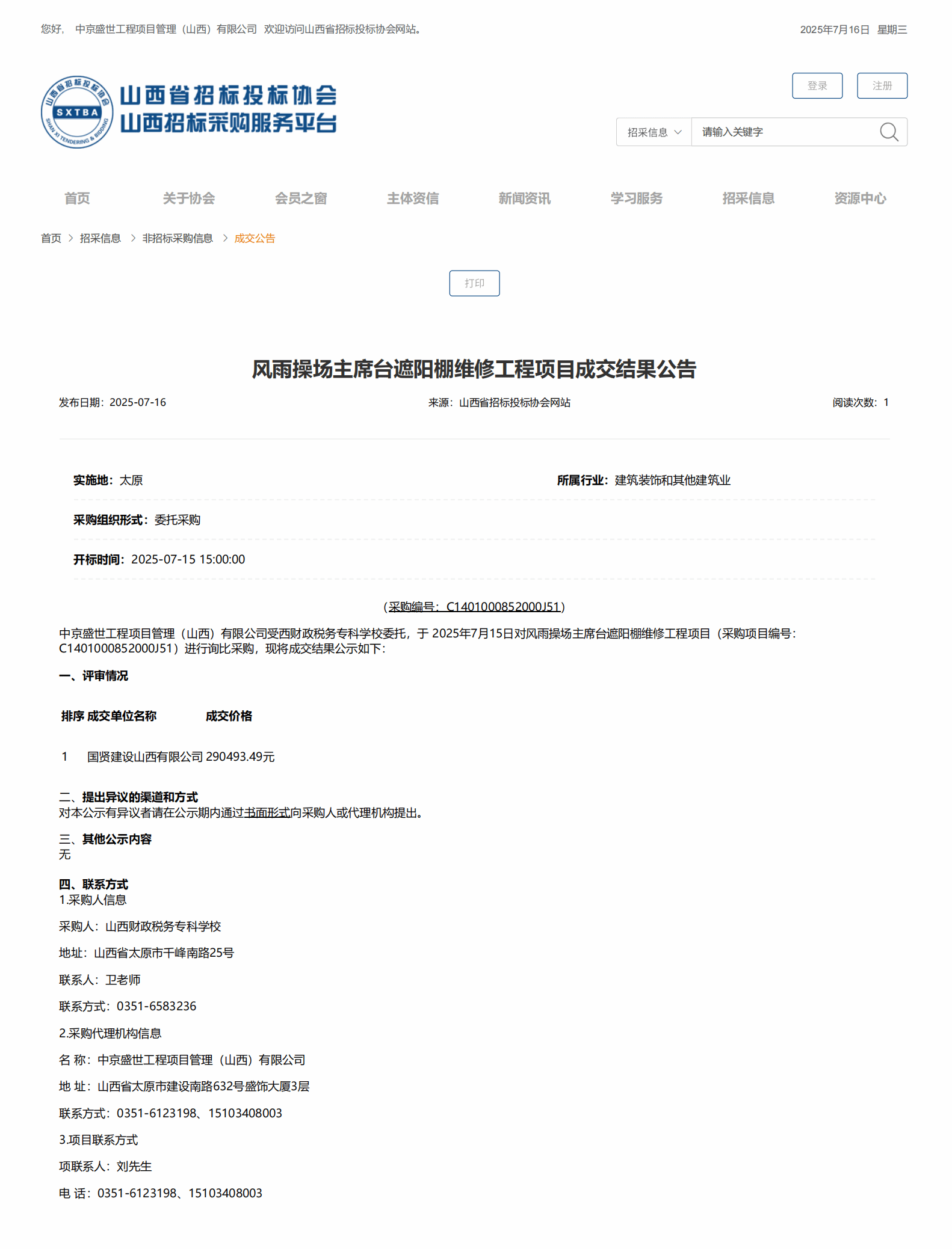 2025年7月16日,中京盛世工程项目管理(山西)有限公司受bat365委托,对bat365“风雨操场主席台遮阳棚维修工程”项目进行招标采购,并于2025年7月15日完成评审工作。 山西省招标投标协会网关于本项目中标结果公告如下: