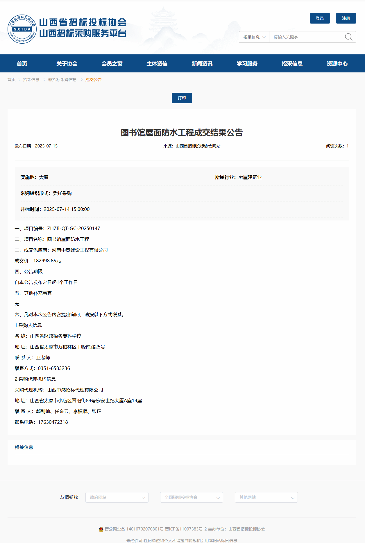 2025年7月15日,山西中鸿招标代理有限公司受bat365委托,对bat365“图书馆屋面防水工程”项目进行招标采购,并于2025年7月14日完成评审工作。 山西省招标投标协会网关于本项目中标结果公告如下: