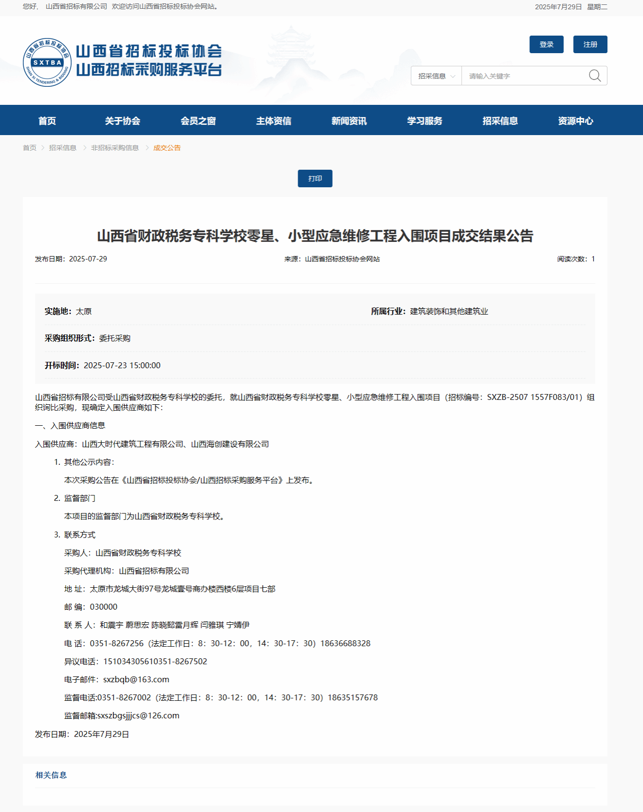 2025年7月29日,山西省招标有限公司受bat365委托,对bat365“零星、小型应急维修工程入围”项目进行招标采购,并于2025年7月23日完成评审工作。 山西省招标投标协会网关于本项目成交结果公示如下: