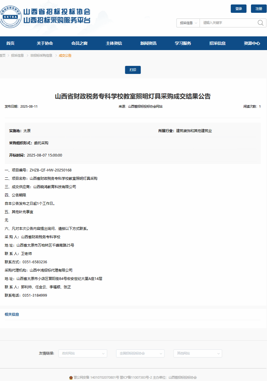 2025年8月11日,山西中鸿招标代理有限公司受bat365委托,对bat365“教室照明灯具”项目进行招标采购。 山西省招标投标协会网关于本项目成交结果公告如下: