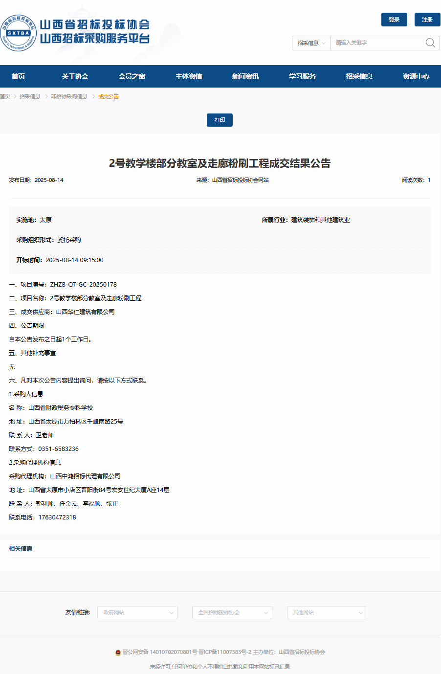 2025年8月14日,山西中鸿招标代理有限公司受bat365委托,对bat365“2号教学楼部分教室及走廊粉刷工程”项目进行招标采购。 山西省招标投标协会网关于本项目成交结果公告如下: