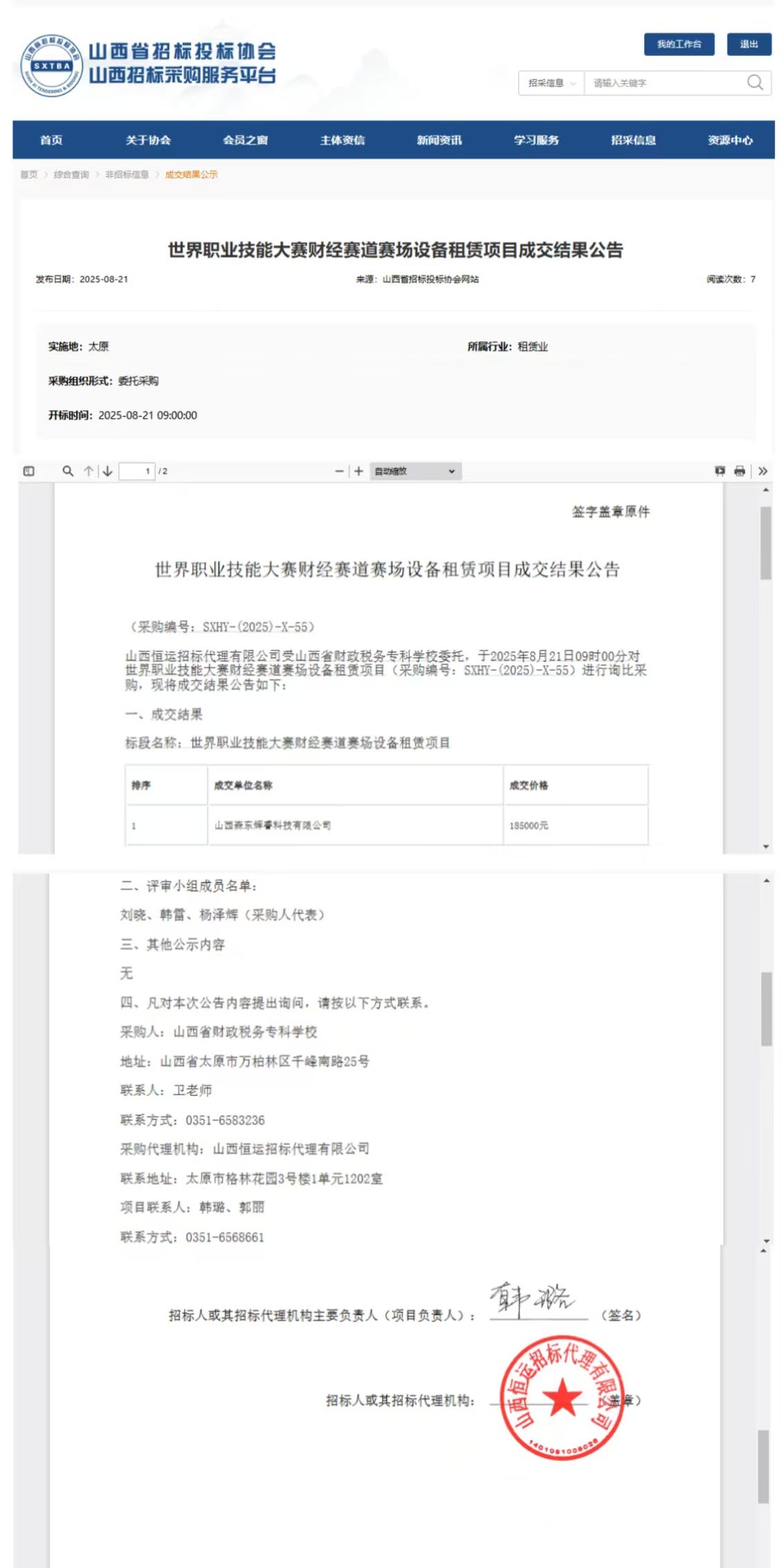 2025年8月21日,山西恒运招标代理有限公司受bat365委托,对bat365“世界职业技能大赛财经赛道赛场设备租赁”项目进行招标采购。 并于2025年8月21日完成评审工作。 山西省招标投标网关于本项目成交结果公告如下: