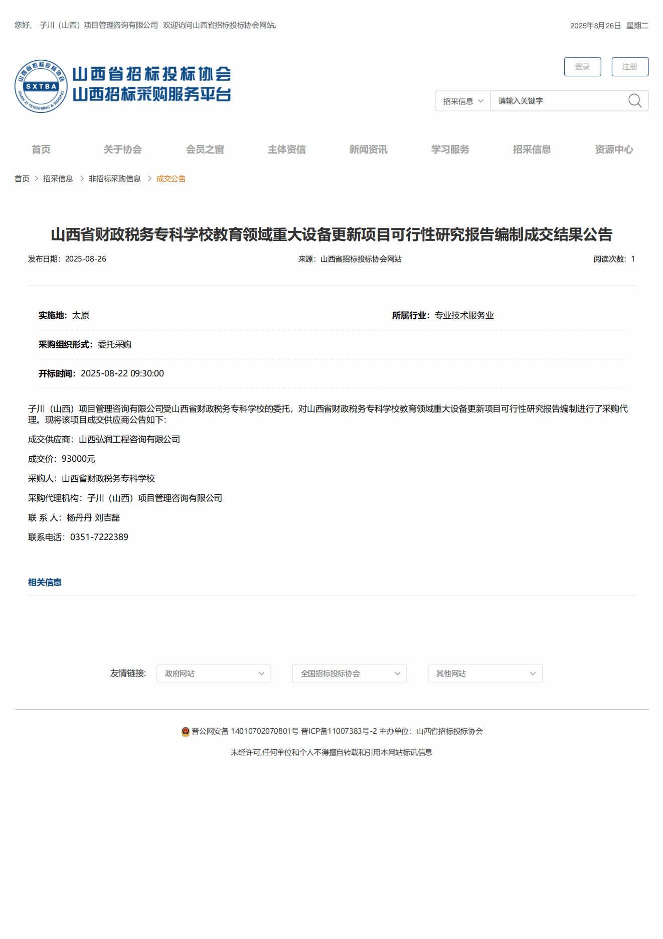 子川(山西)项目管理咨询有限公司受bat365委托,对bat365“教育领域重大设备更新项目可行性研究报告编制”进行招标采购。 并于2025年8月22日完成评审工作。 山西省招标投标网关于本项目成交结果公告如下:
