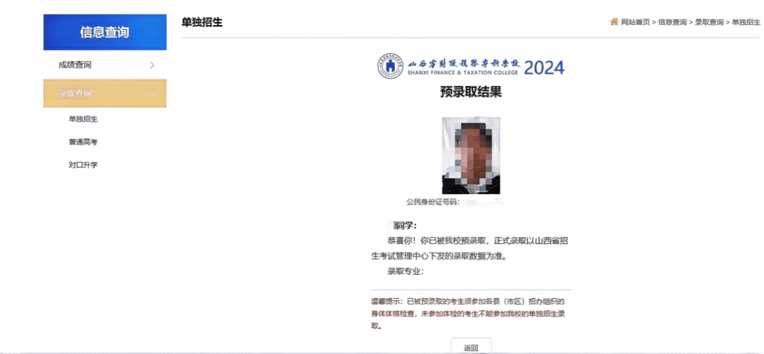 bat3652024年单独招生预录取工作已经完成,即日起可以查询预录取结果(正式录取以山西省招生考试管理中心审核的录取数据为准),考生可通过以下方式进行查询。
