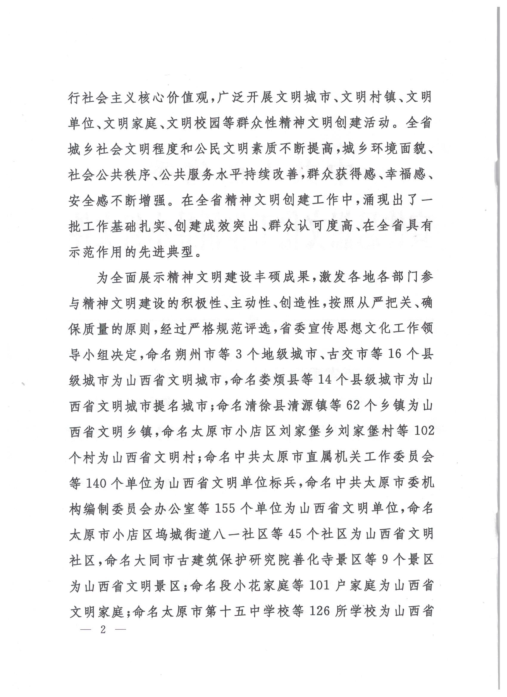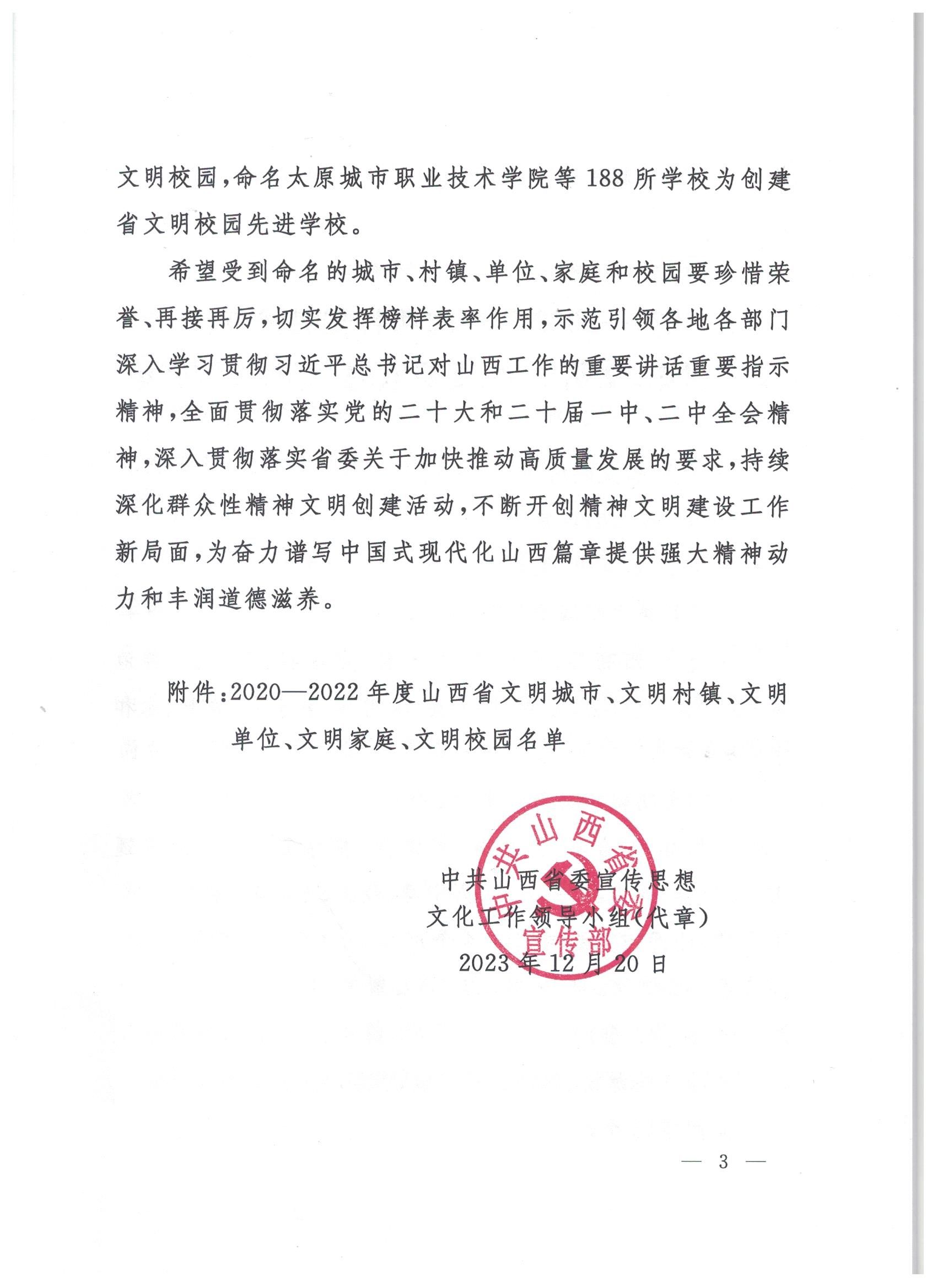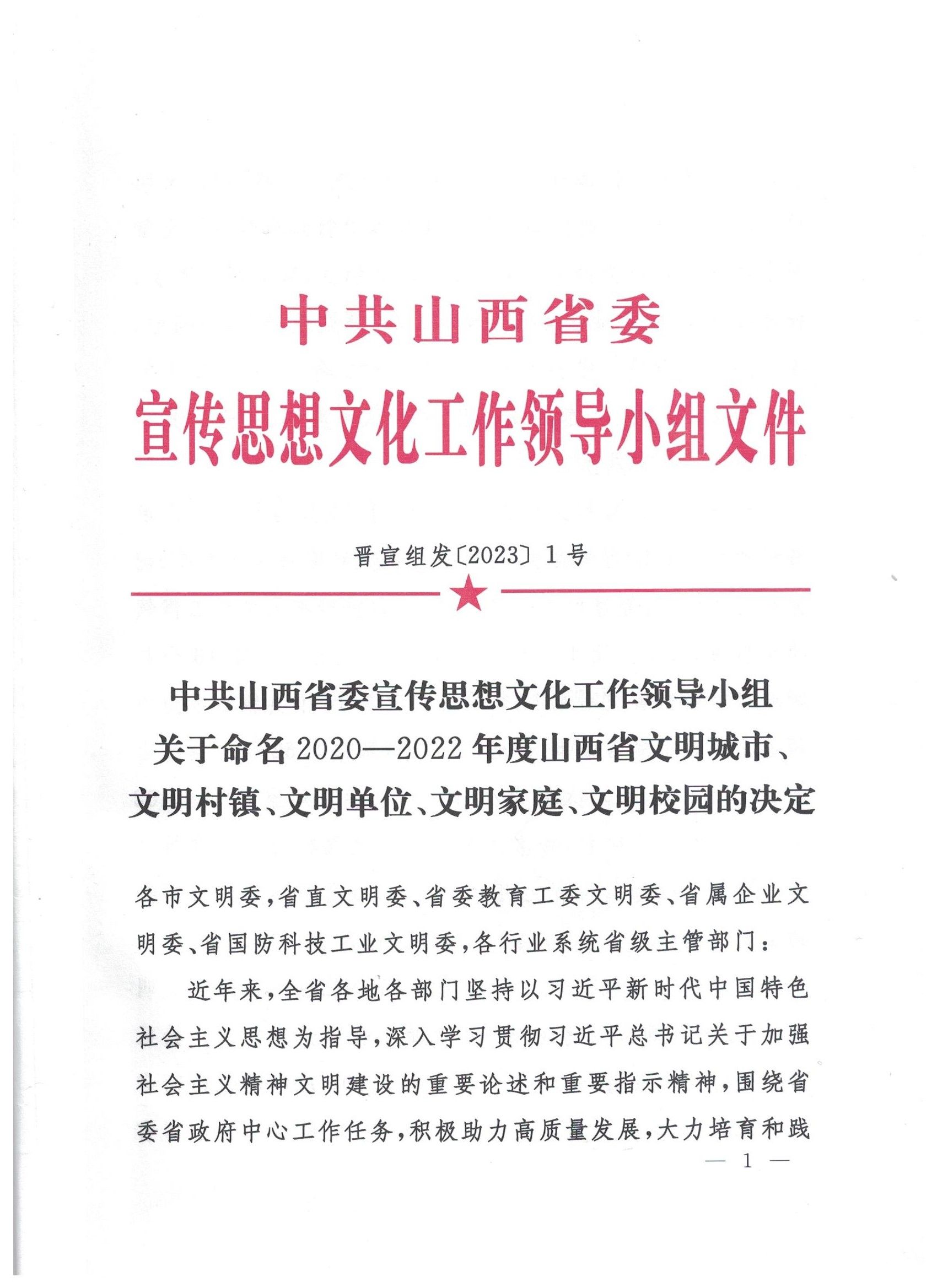 根据中共山西省委宣传思想文化工作领导小组印发的《关于命名2020-2022年度山西省文明城市、文明村镇、文明单位、文明家庭、文明校园的决定》(晋宣组发〔2023〕1号),bat365荣获“山西省文明校园”称号。
