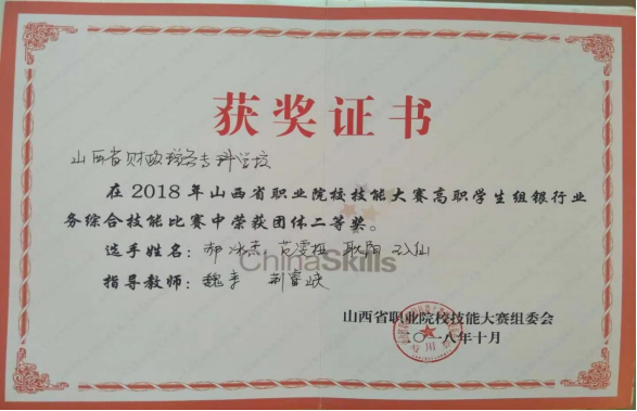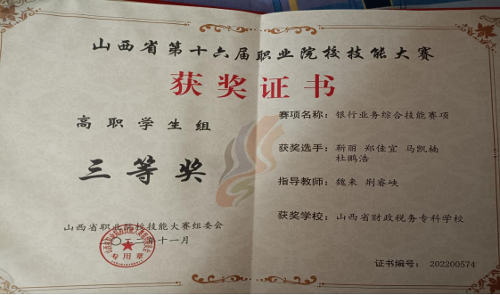 ⑤荣获全国大学生银行综合业务技能大赛团体一等奖一次、山西省职业院校技能大赛高职组银行业务综合技能比赛团体二等奖两次。